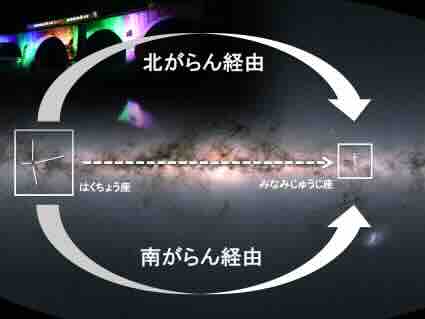 「はくちょう座」の北十字から「みなみじゅうじ座」の南十字に向かう。北側のハロー(がらんとした空)を旅する。一方、南側のハローを旅する。二人に、旅の途中、どんな美しい光景を見るのだろう。